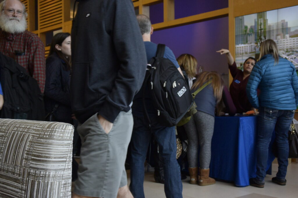 Waiting at the Semester at Sea Registration Line. San Diego Harbor Hilton Hotel. Nikon 1 V3 camera and 10-30 mm lens.